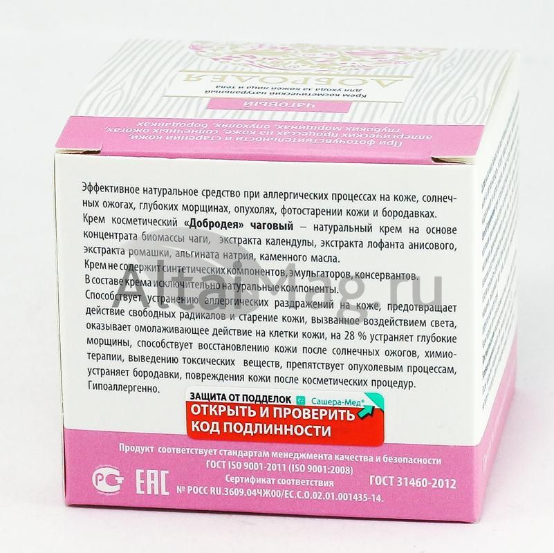 Крем косметический «Чаговый» серии «Добродея» - натуральный крем на основе концентрата биомассы чаги, экстракта календулы, экстракта лофанта анисового, экстракта ромашки, альгината натрия, каменного масла. Крем не содержит синтетических компонентов, эмульгаторов, консервантов.