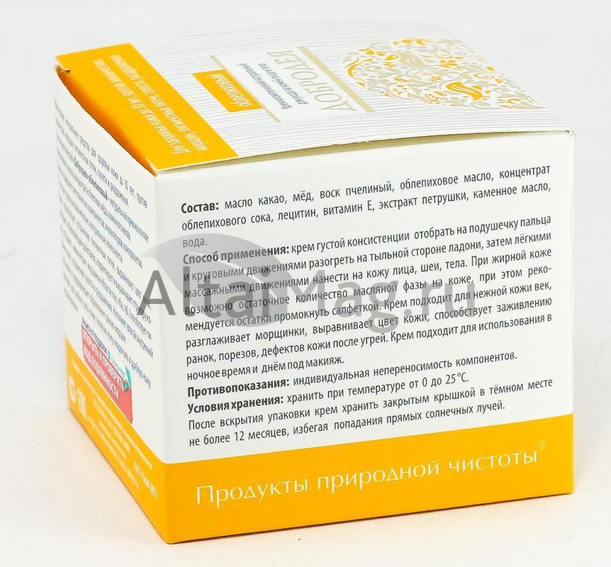 Крем косметический «Облепиховый» серии «Добродея» - натуральный крем на основе облепихового масла, концентрата облепихи, мёда, каменного масла. Крем не содержит синтетических компонентов, эмульгаторов, консервантов.
