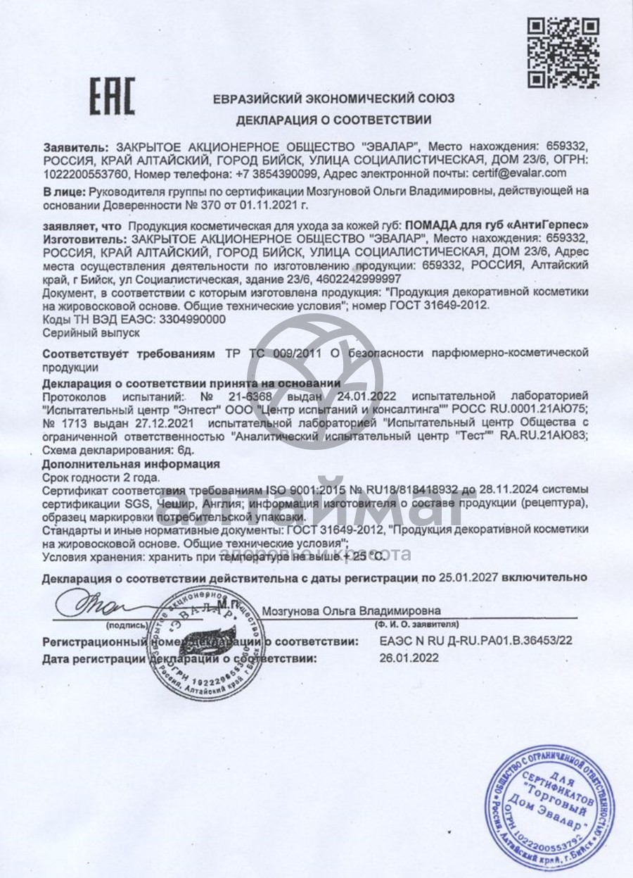 Благодаря тщательно подобранным компонентам состава, помада для губ Эвалар предотвращает развитие вируса герпеса, способствует быстрому устранению герпетических высыпаний; рекомендуется в качестве профилактического средства при герпетической инфекции кожи и слизистых оболочек.