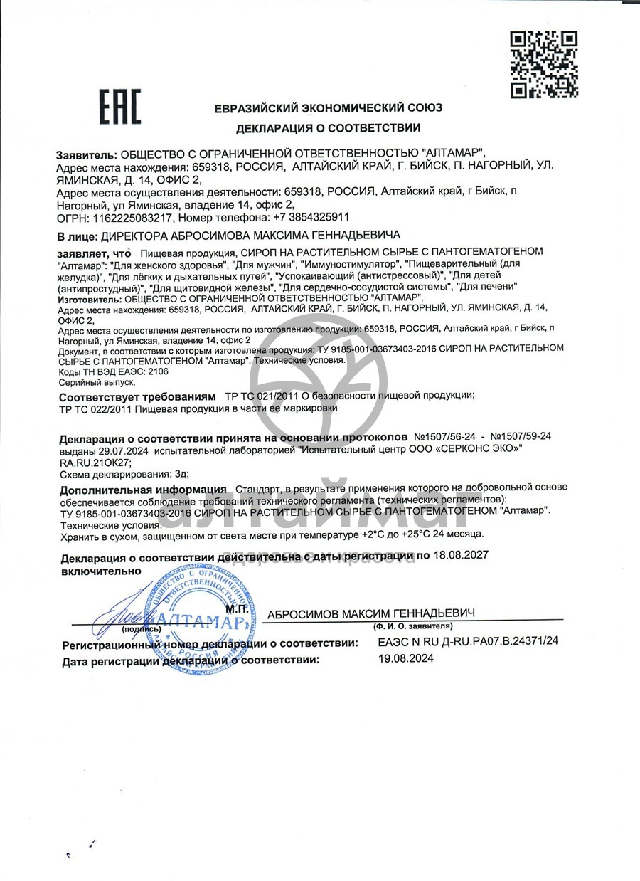 Есть вопросы по товару "Сироп с пантогематогеном Алтамар для печени 250мл"?